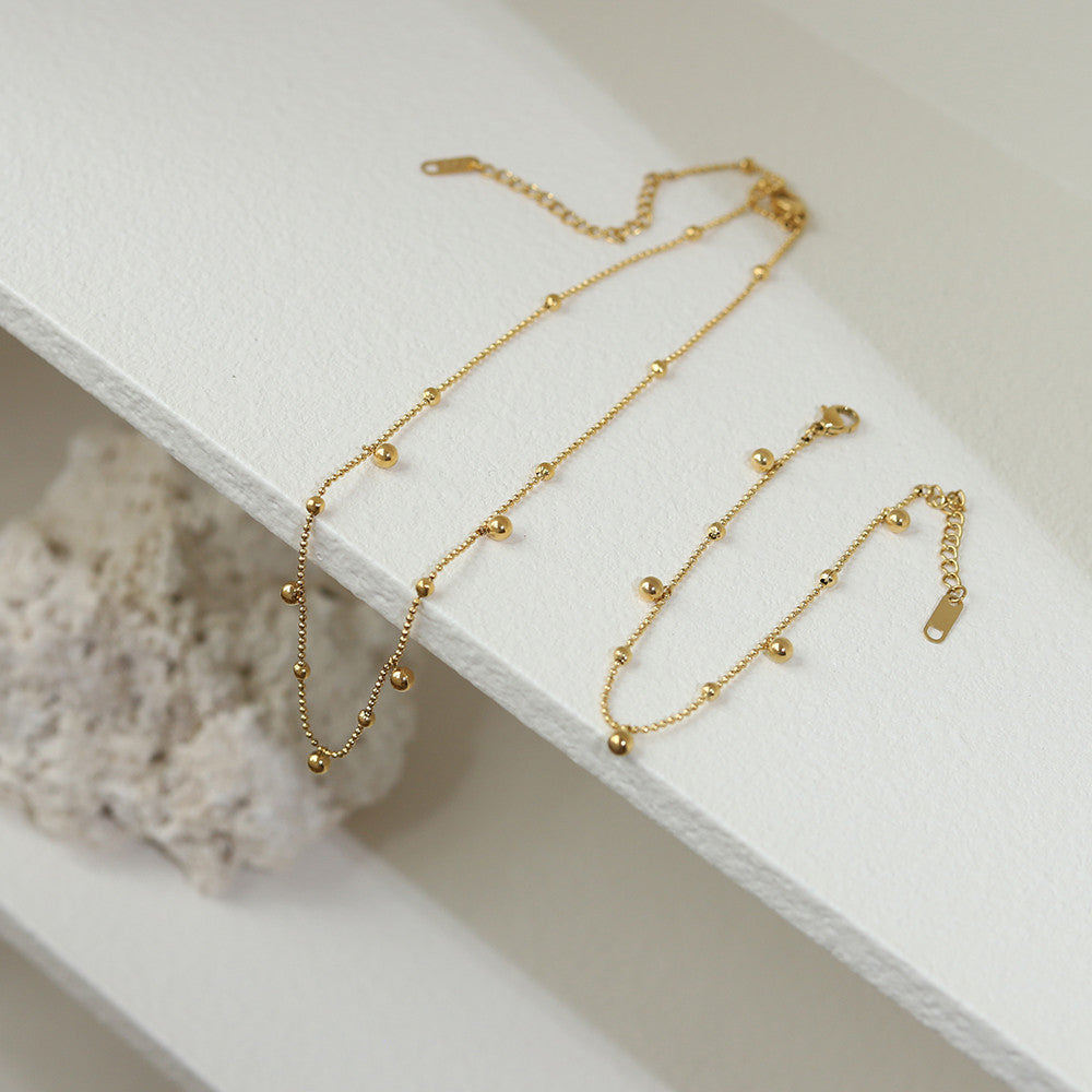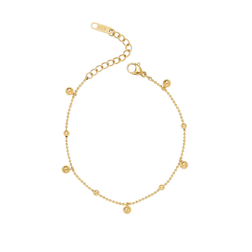 Indulge in elegance with our Beaded Ball Bracelet. Crafted from gold-plated stainless steel, this stunning piece features a delicate gold ball chain and intricate gold beads. Its stylish and elegant design adds a touch of sophistication to any outfit. Elevate your look with this exquisite accessory.