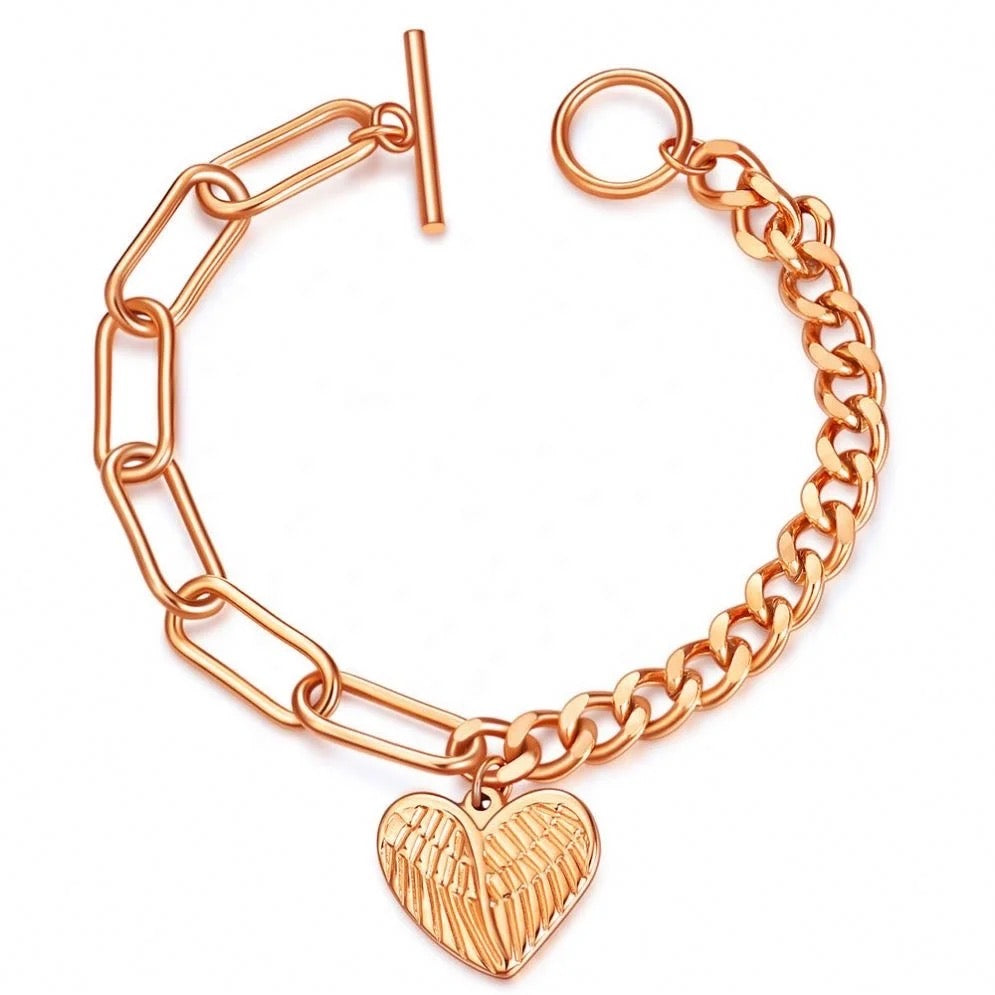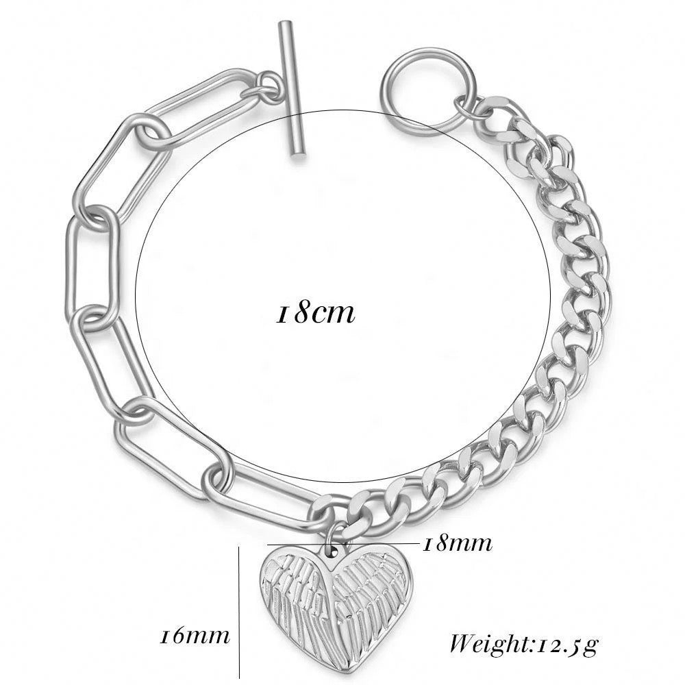 Indulge in timeless elegance with our Link Bracelet with Heart. Crafted from high-quality stainless steel, this 18k gold/rose gold plated, or silver colour bracelet exudes a classic charm. The joint-style link design adds a unique touch, while the toggle clasp ensures a secure fit. The highlight of this piece is the wing heart-shaped charm, symbolizing love and freedom.