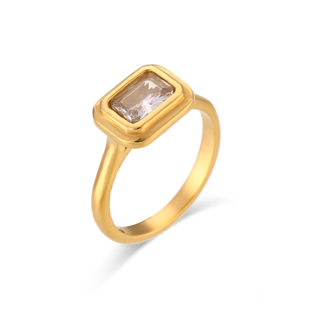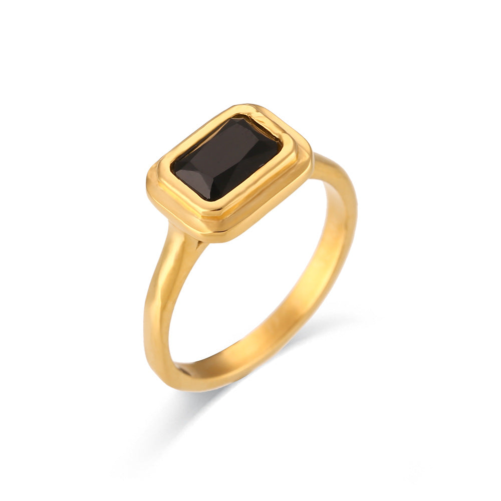 Indulge in elegance to raise your style with this East-West Emerald-Cut Ring, crafted from Gold-Plated Stainless Steel. The sleek, modern design pairs with vibrant black or white gemstone, promising to catch eyes and spark conversations. Perfect for the chic and youthful spirit.