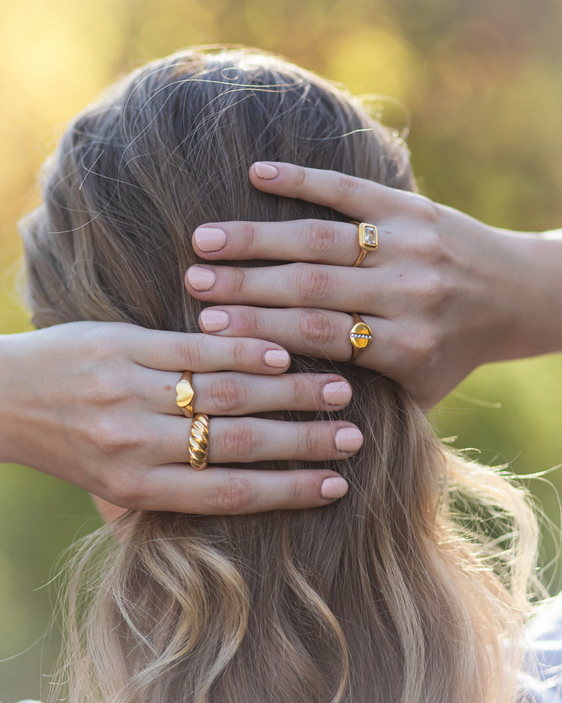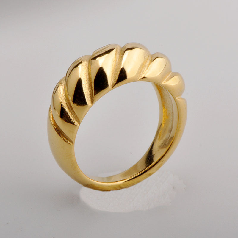 Introducing our stunning Croissant Dome Ring. Crafted from Gold-Plated Stainless Steel, this elegant piece features an intricate croissant pattern, adding a touch of sophistication to any outfit.